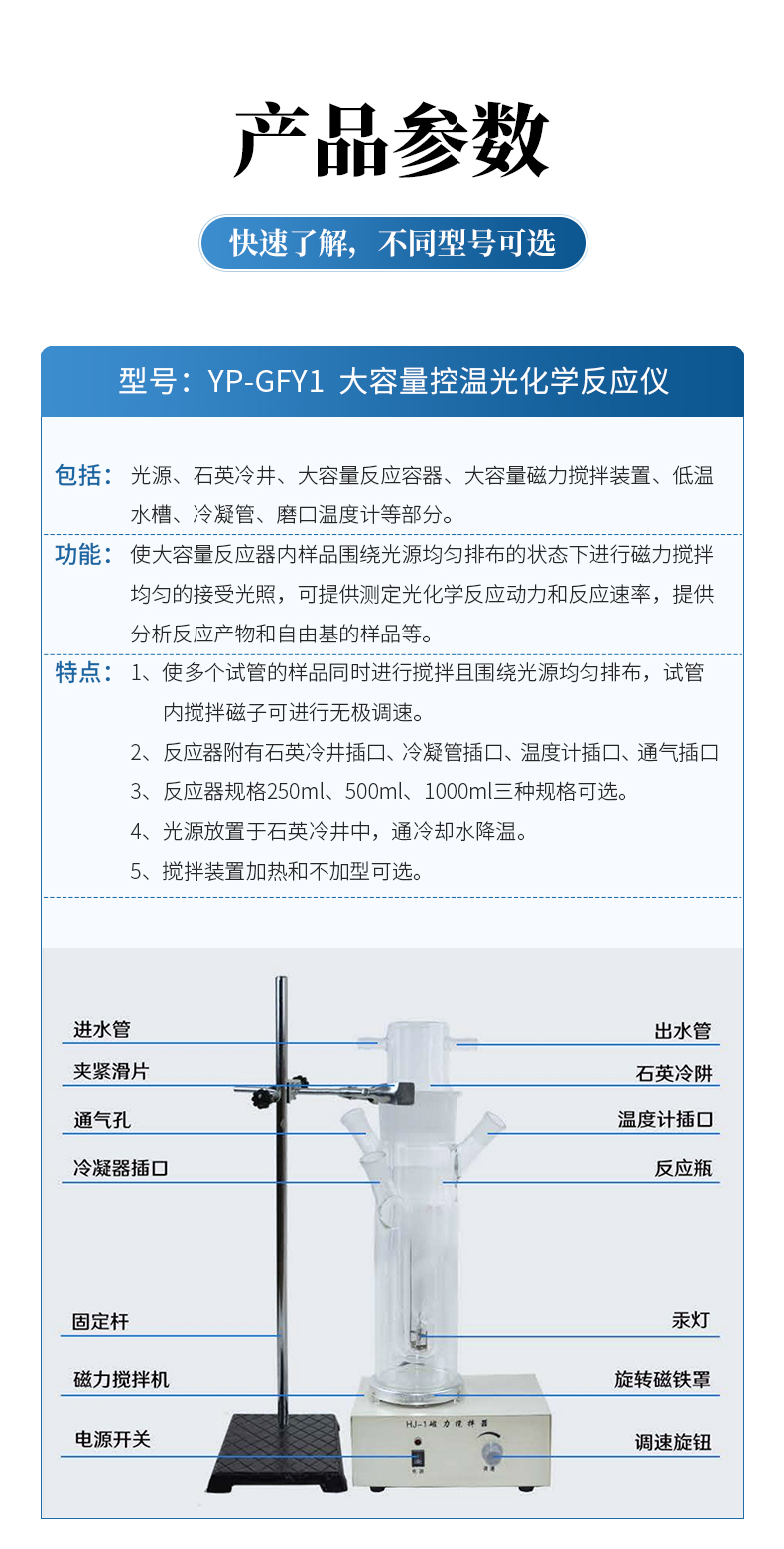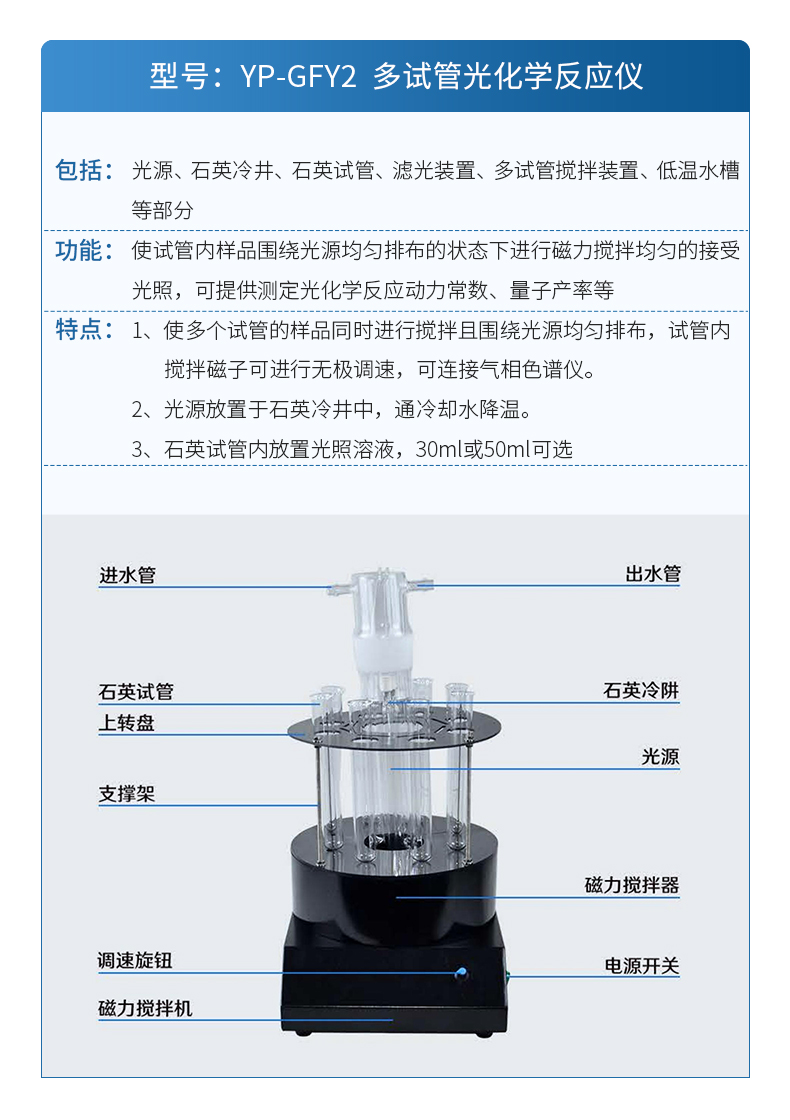 | YP-GFY2 多試管反應(yīng)器 | 包括:光源、石英冷井、石英試管、濾光裝置、多試管攪拌裝置、低溫水槽等部分。 功能:使試管內(nèi)樣品圍繞光源均勻排布的狀態(tài)下進(jìn)行磁力攪拌均勻的接受光照,可提供測(cè)定光化學(xué)反應(yīng)動(dòng)力常數(shù)、量子產(chǎn)率等 特點(diǎn):1、使多個(gè)試管的樣品同時(shí)進(jìn)行攪拌且圍繞光源均勻排布,試管內(nèi)攪拌磁子可進(jìn)行無(wú)極調(diào)速,可連接氣相色譜儀。 2、光源放置于石英冷井中,通冷卻水降溫。 3、石英試管內(nèi)放置光照溶液,30ml或50ml可選 |