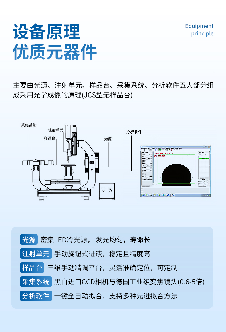 如上圖、接觸角測(cè)量?jī)x主要由光源、注射單元、樣品臺(tái)、采集系統(tǒng)、分析軟件五大部分組成,設(shè)備采用光學(xué)成像的原理。