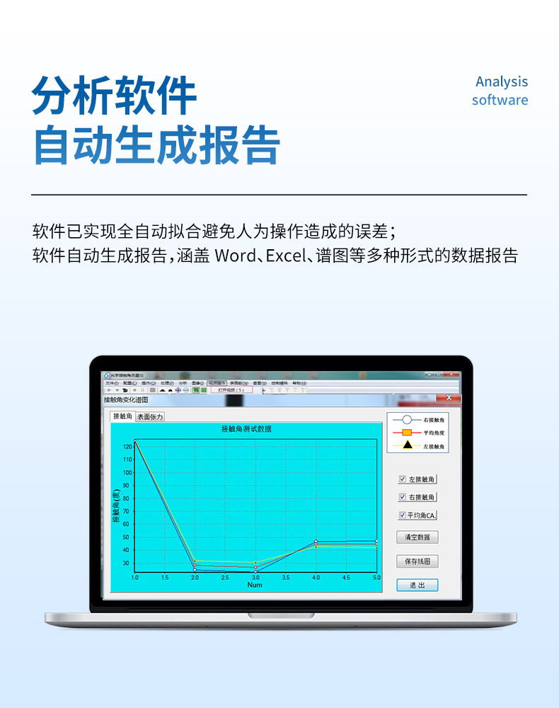 具備雙邊接觸角測(cè)量快速擬合功能,更全面量分析液體與固體的表面潤(rùn)濕性能、更準(zhǔn)確的分析表面的
