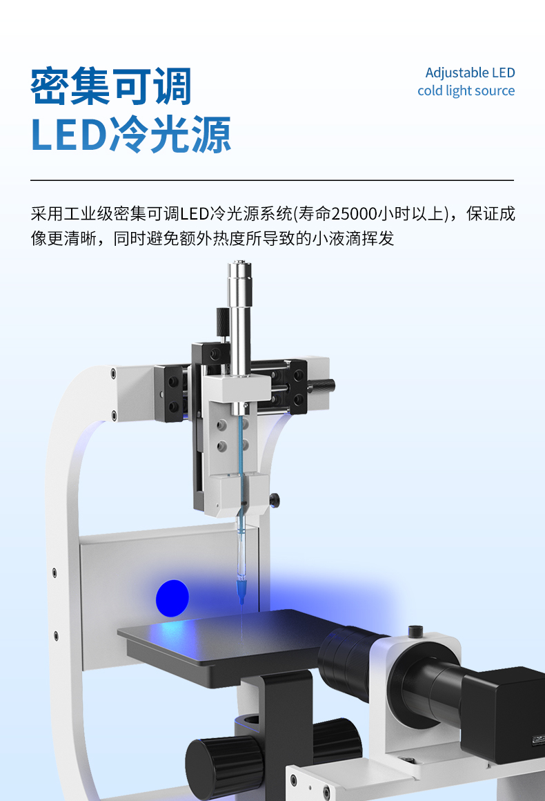 2. 采用工業(yè)級密集可調(diào)LED冷光源系統(tǒng)(壽命25000H以上),保證成像更清晰,同時避免額外熱度所導(dǎo)致的小液滴揮發(fā);