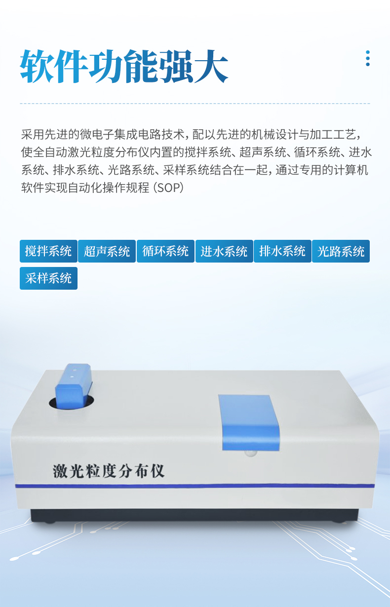 激光粒度分布儀系統(tǒng)是集光、機(jī)、電、計(jì)算機(jī)為一體的高科技產(chǎn)品,數(shù)據(jù)處理有專用的計(jì)算機(jī)分析系統(tǒng)軟件完成,同時(shí)由打印機(jī)完成測(cè)試報(bào)告的輸出。