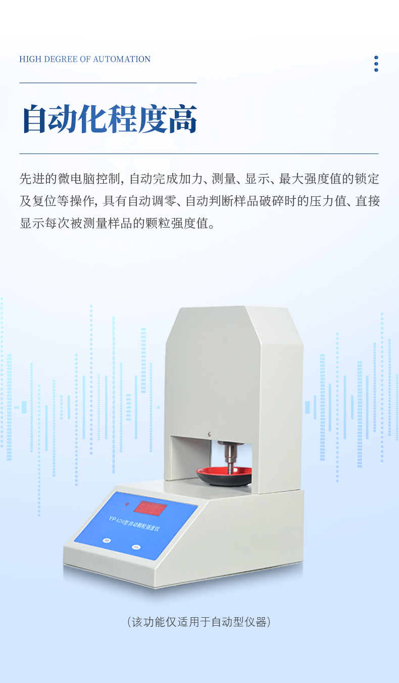儀器采用先進的微電腦控制,自動完成加力、測量、顯示、最大強度值的鎖定及復(fù)位等操作,具有自動調(diào)零、自動判斷樣品破碎時的壓力值、直接顯示每次被測量樣品的顆粒強度值。是催化劑、化肥、藥品、水果等顆粒樣品聚合強度測定最理想的新型試驗儀器。