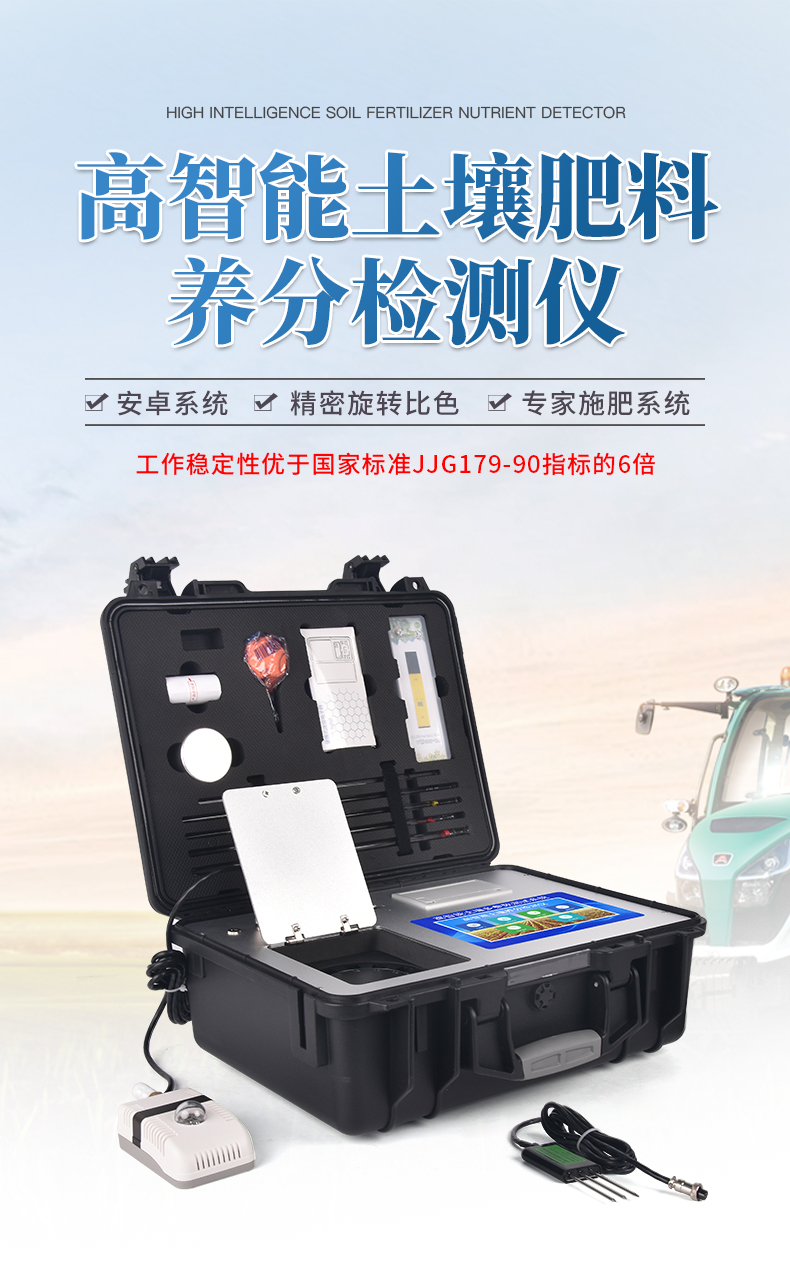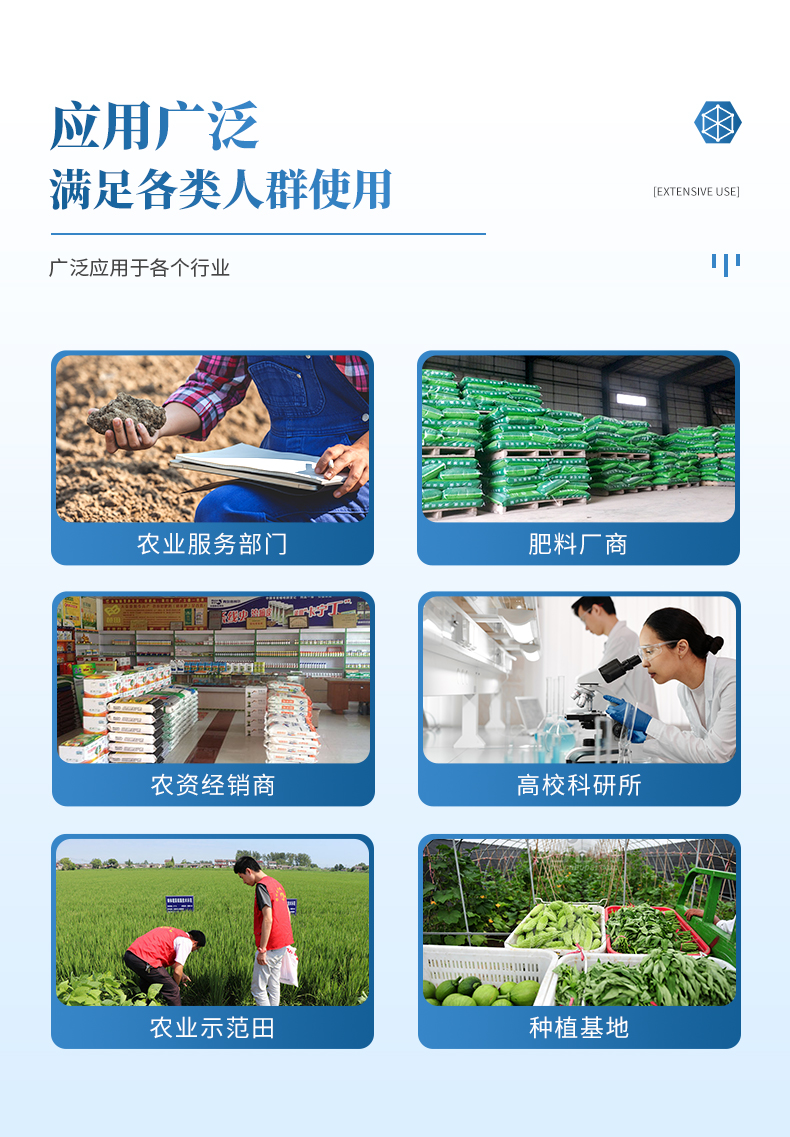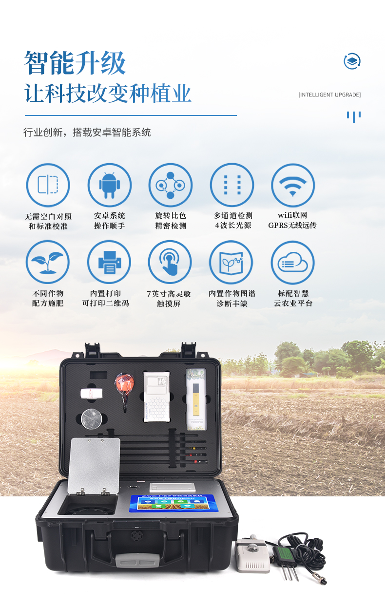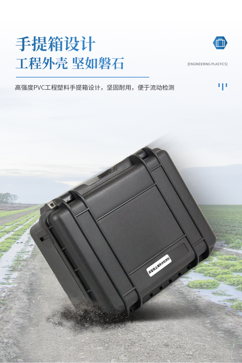 配套齊全:該儀器集藥、器、儀為一體,攜帶方便,相當(dāng)于一個(gè)小型移動(dòng)實(shí)驗(yàn)室,無(wú)需用戶自配附件,亦可靈活野外流動(dòng)測(cè)試。適于農(nóng)業(yè)服務(wù)部門或農(nóng)資經(jīng)銷商、高教院校、科研院所、合作社、肥料廠商、大種植戶測(cè)土施肥和鑒別肥料真假及環(huán)保檢測(cè)應(yīng)用。