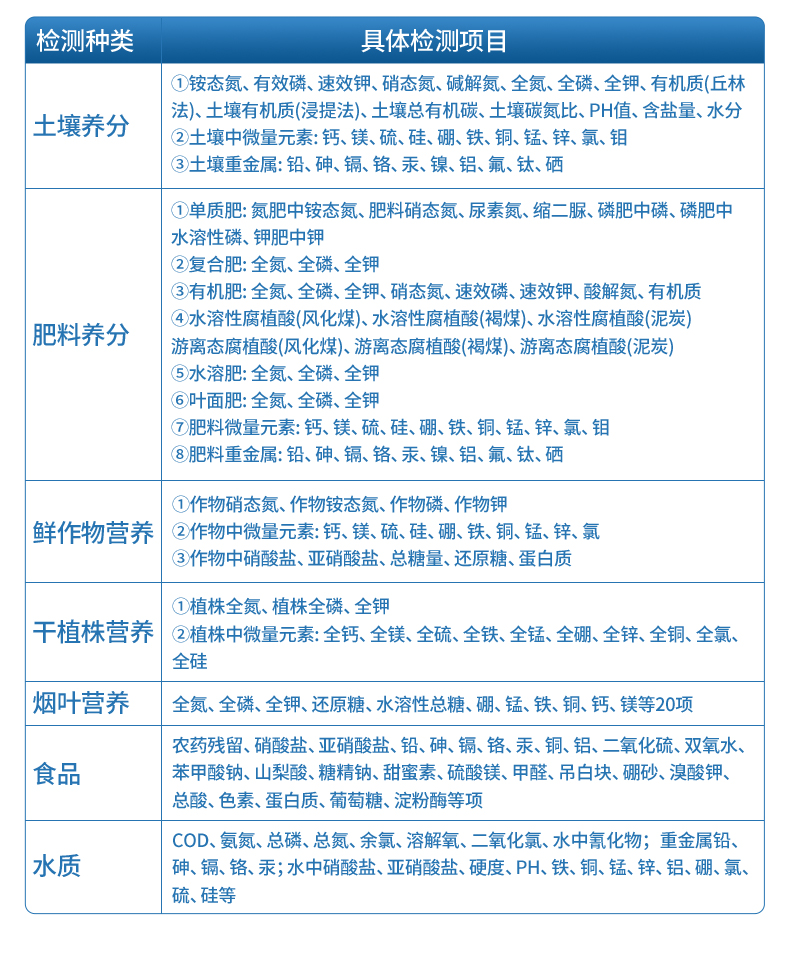 3、肥料養(yǎng)分:●單質(zhì)肥:氮肥中銨態(tài)氮、肥料硝態(tài)氮、尿素氮、縮二脲、磷肥中磷、磷肥中水溶性磷、鉀肥中鉀;●復(fù)合肥全氮、復(fù)合肥全磷、復(fù)合肥全鉀;●有機(jī)肥全氮、有機(jī)肥全磷、有機(jī)肥全鉀、有機(jī)肥硝態(tài)氮、有機(jī)肥速效磷、有機(jī)肥速效鉀、有機(jī)肥酸解氮、有機(jī)質(zhì);●水溶性腐植酸(風(fēng)化煤)、水溶性腐植酸(褐煤)、水溶性腐植酸(泥炭)、游離態(tài)腐植酸(風(fēng)化煤)、游離態(tài)腐植酸(褐煤)、游離態(tài)腐植酸(泥炭);●水溶肥全氮、水溶肥全磷、水溶肥全鉀;●葉面肥全氮、葉面肥全磷、葉面肥全鉀;●各種肥料微量元素:肥料鈣、肥料鎂、肥料硫、肥料硅、肥料硼、肥料鐵、肥料銅、肥料錳、肥料鋅、肥料氯、肥料鉬;●肥料重金屬:肥料鉛、肥料砷、肥料鎘、肥料鉻、肥料汞、肥料鎳、肥料鋁、肥料氟、肥料鈦、肥料硒。