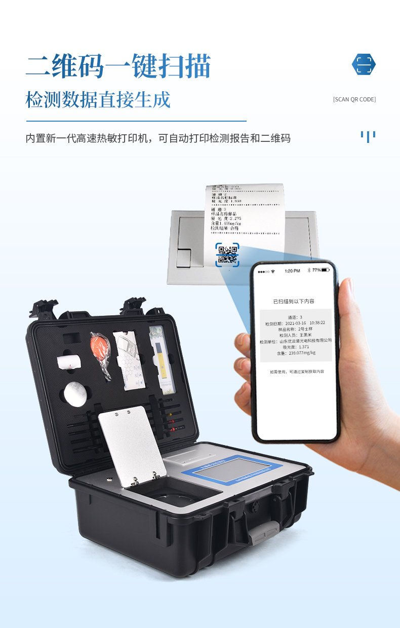 18、內(nèi)置新一代高速熱敏打印機(jī)(無(wú)需色帶),打印內(nèi)容包含:檢測(cè)單位、檢測(cè)人員、檢測(cè)項(xiàng)目、通道號(hào)、吸光度、養(yǎng)分含量(mg/kg)、檢測(cè)時(shí)間、以及二維碼等信息