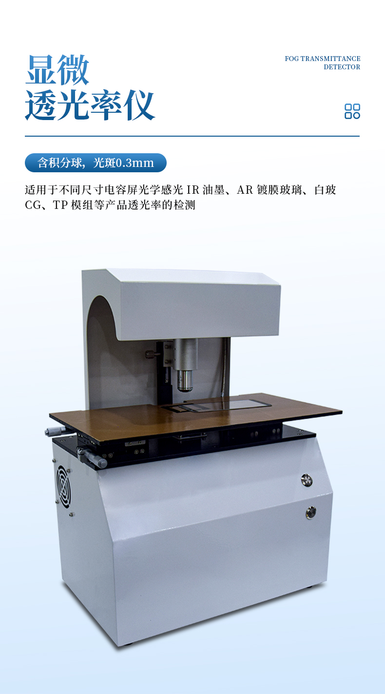 適用于不同尺寸電容屏光學(xué)感光IR油墨、AR 鍍膜玻璃、白玻CG、TP模組等產(chǎn)品透光率的檢測,尤其適用于IR油墨與ICON(圖標(biāo))快速實時多波長透光率測量。