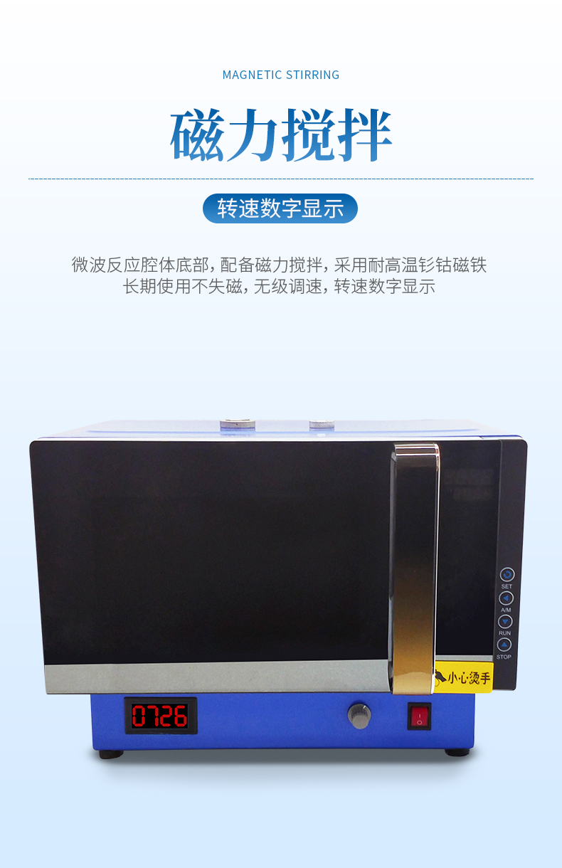 微波反應腔體底部,配備磁力攪拌,采用耐高溫釤鈷磁鐵,最大工作溫度可達350℃,長期使用不失磁,無級調(diào)速,轉(zhuǎn)速數(shù)字顯示。