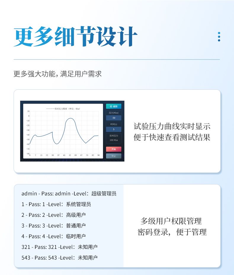 4. 試驗(yàn)曲線實(shí)時(shí)展示試驗(yàn)過(guò)程中壓力的變化趨勢(shì),試驗(yàn)數(shù)據(jù)智能統(tǒng)計(jì);