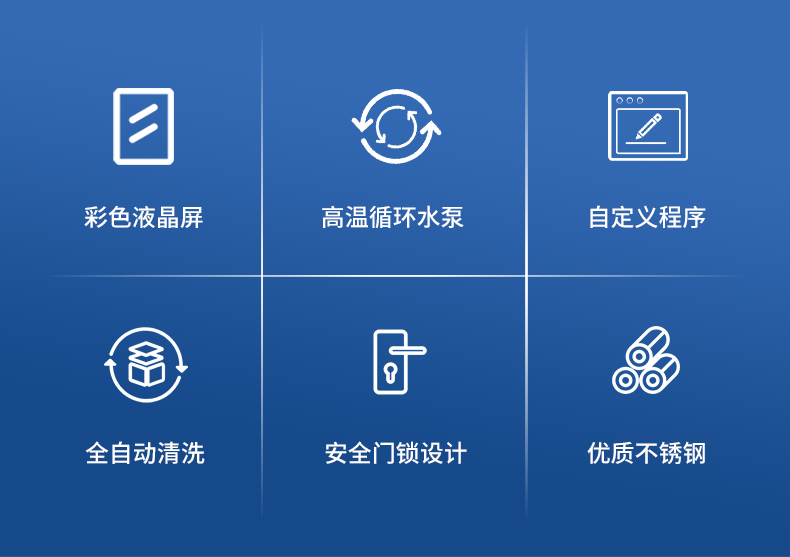 3.2 控制屏全中文操作界面,操作和報(bào)警均中文提示,簡(jiǎn)潔操作,設(shè)有快速、標(biāo)準(zhǔn)、加強(qiáng)三個(gè)清洗模式,清洗程序免除自行設(shè)定功能,清洗更簡(jiǎn)便。