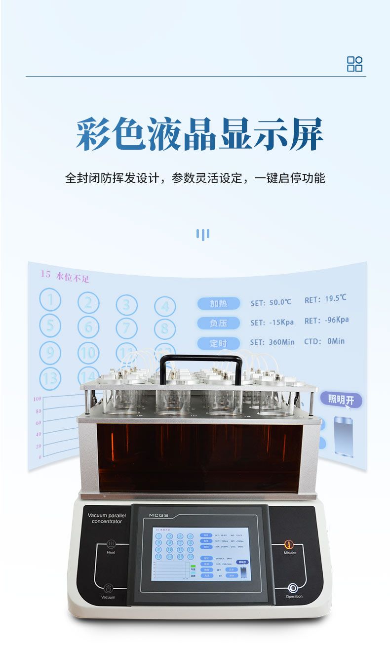平穩(wěn)的圓周搖晃,加大蒸發(fā)面積,加快樣液混勻和熱量傳遞,避免樣液的暴沸。溫和的水浴環(huán)境利于低沸點(diǎn)溶劑的蒸發(fā)和待測(cè)目標(biāo)物在揮發(fā)過(guò)程中的保留。數(shù)字型的真空控制模式,高靈敏傳感器實(shí)時(shí)檢測(cè)真空度,避免樣液在過(guò)低壓力下爆沸造成目標(biāo)待測(cè)物的損失。